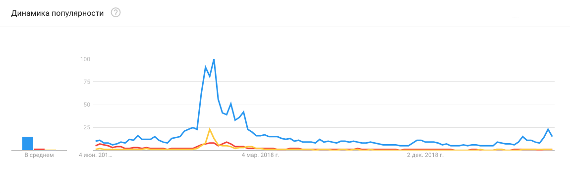 Голубая линия — популярность запроса «bitcoin» в гугле за последние два года, красная и желтые линии — популярность запросов «ethereum» и «litecoin». Пик в левой части графика — конец 2017 года, когда курс биткоина вырос до 17 000–20 000 долларов. Интерес к биткоину растет, но далеко от того, что был в конце 2017-го.