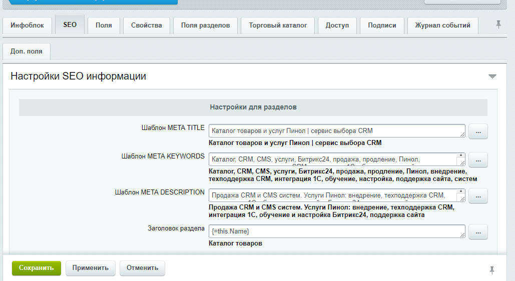 Старайтесь не использовать шаблоны, а создавать различные описания для каждой отдельной страницы вашего сайта. Поисковые системы не любят повторений. Если ваш сайт слишком большой, и прописать description для каждой страницы затруднительно, сделайте это хотя бы для самых основных разделов. Для прочих можно составить общее описание: редактировать его можно в разделе «Настройки» -> «SEO». Введите текст в поле «Мета-описание страницы по умолчанию», активируйте соответствующую галочку и сохраните изменения.